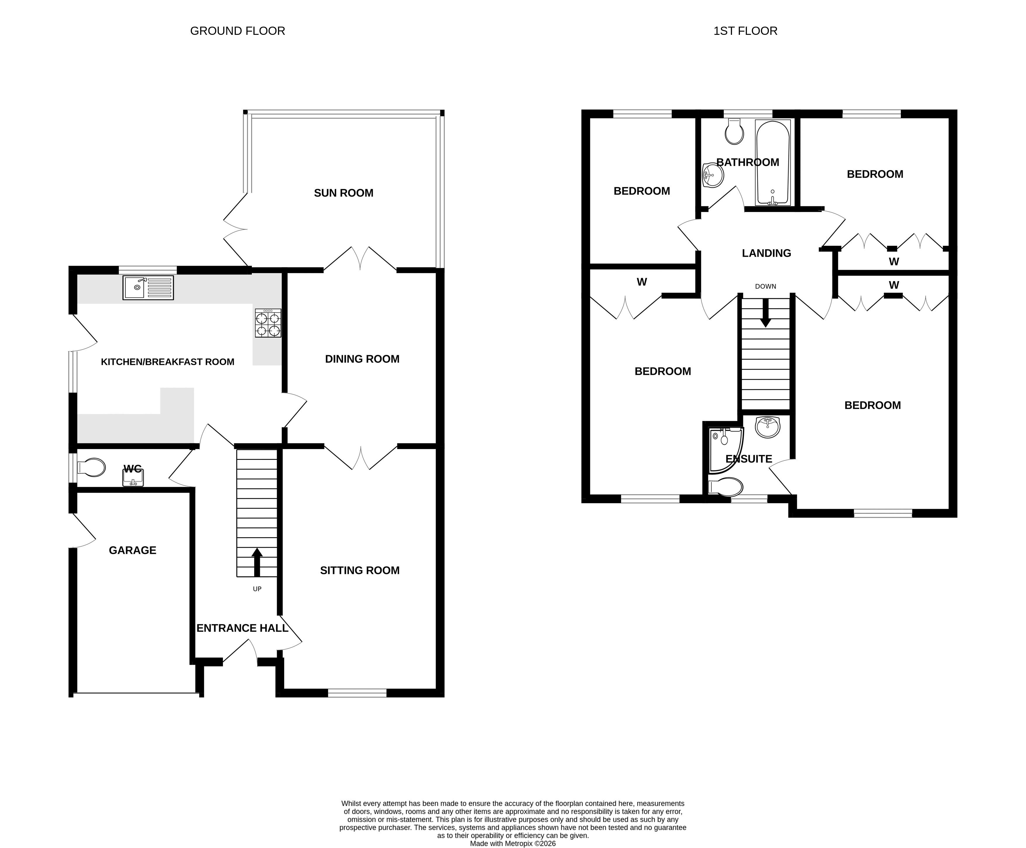 The generous sitting room is a lovely reception space, centred around a feature fireplace, with French doors opening into the dining room. The dining room provides an ideal space for entertaining and family meals, with further doors leading to both the sun room and the kitchen/breakfast room. The sun room enjoys pleasant views over the rear garden and benefits from a recently updated insulated roof, creating a comfortable year-round living space. The kitchen/breakfast room is fitted with a range of attractive wall and base units, complemented by a breakfast bar. Integrated appliances include an electric oven/grill, separate four-ring gas hob with extractor hood above, and dishwasher, with additional space for further appliances. A side door provides external access. To the first floor, the landing leads to four well-proportioned bedrooms and the family bathroom. The principal bedroom benefits from built-in double wardrobes and an en-suite shower room comprising a modern shower cubicle, low-level WC and wash hand basin with vanity storage. Bedrooms two and three also feature built-in wardrobes.